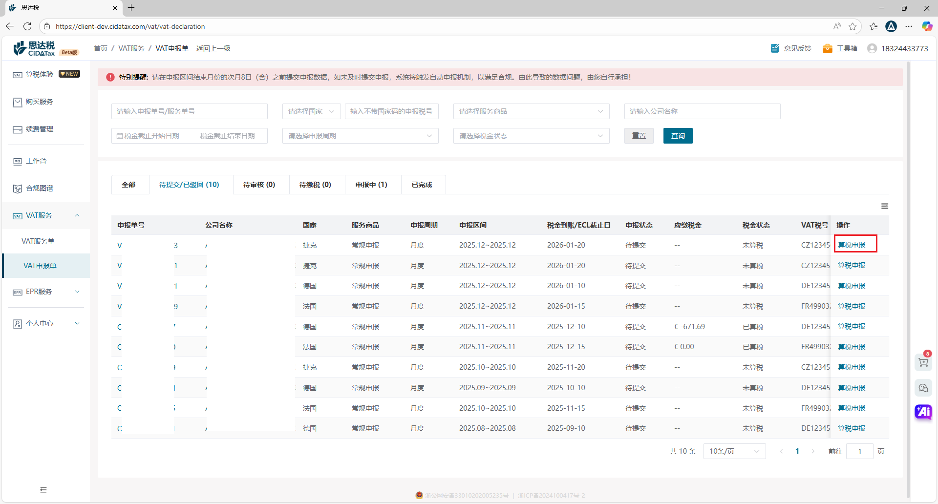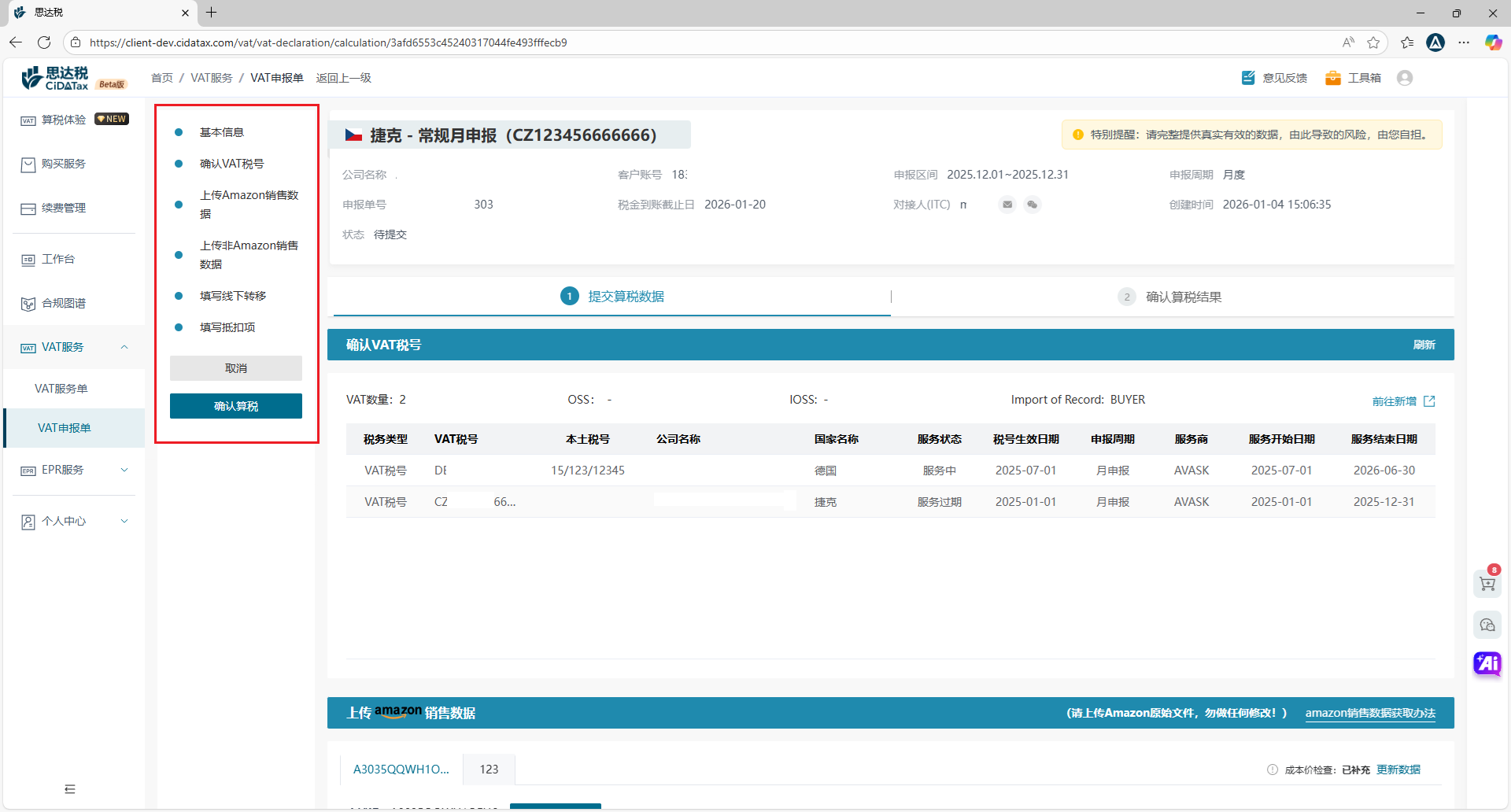 VAT申报单与操作流程 算税申报点击“VAT申报单”,进入VAT申报单的全生命周期管理页面。首先,您只需在“待算税”页签,点击【算税申报】进入算税申报页面,提交所需申报的数据:确认VAT税号Amazon销售数据线下转移抵扣项完成后,点击【确认算税】,算税引擎将为您呈现精准专业的算税结果,包含:不同申报栏次的汇总对应的交易明细信息