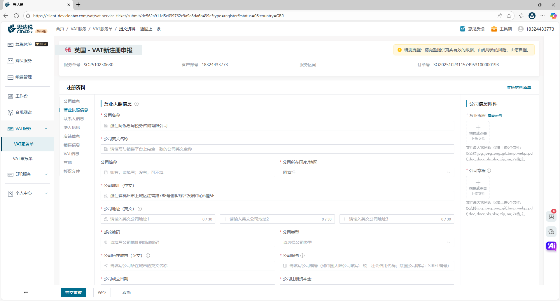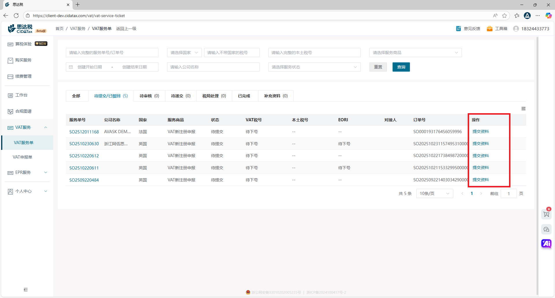 • 点击“VAT服务单”,进入VAT服务单的全生命周期管理页面。