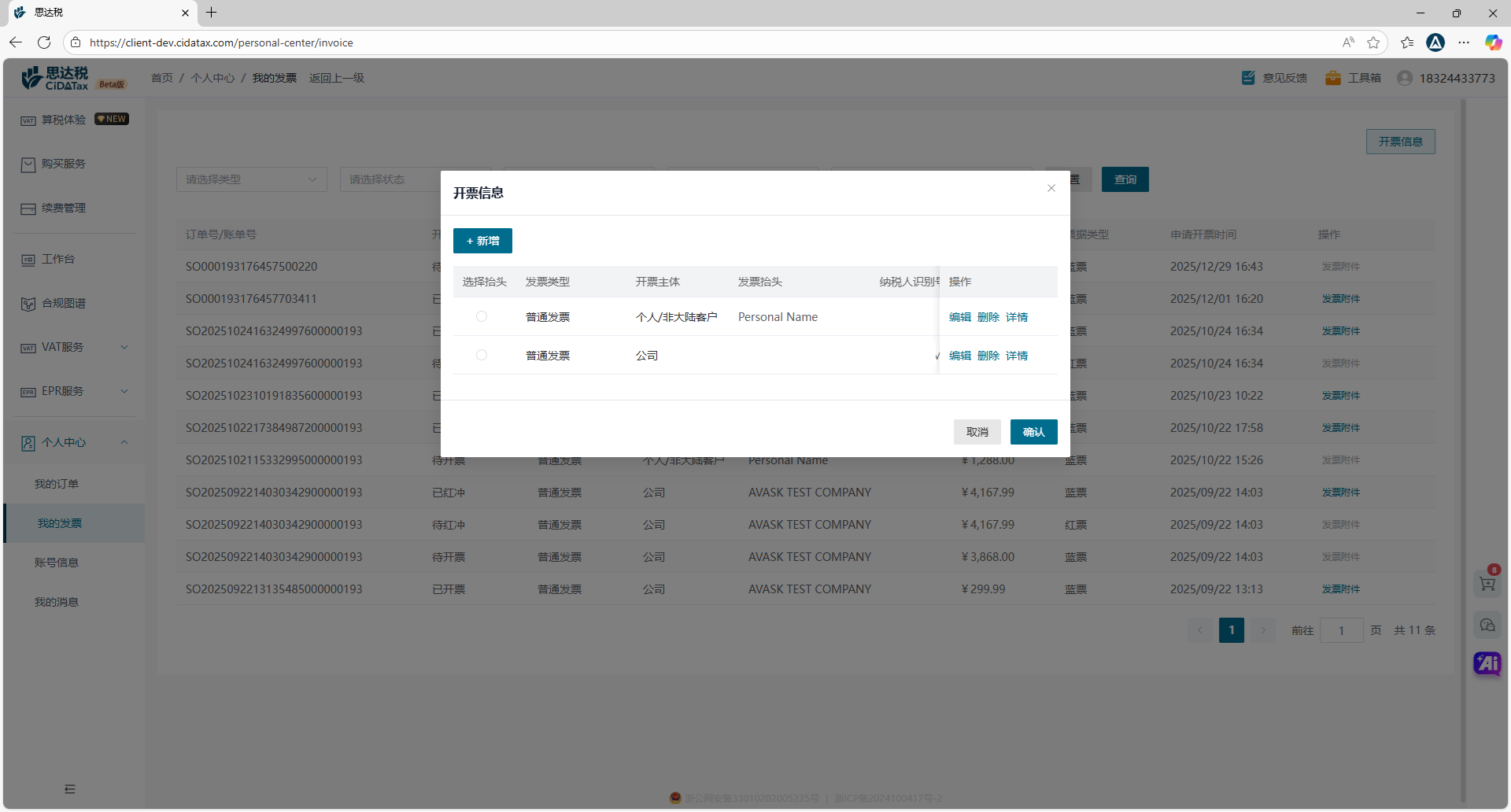 点击【个人中心】-【我的发票】,您可在此管理您的发票信息,包括新增发票、修改发票、删除开票信息等。